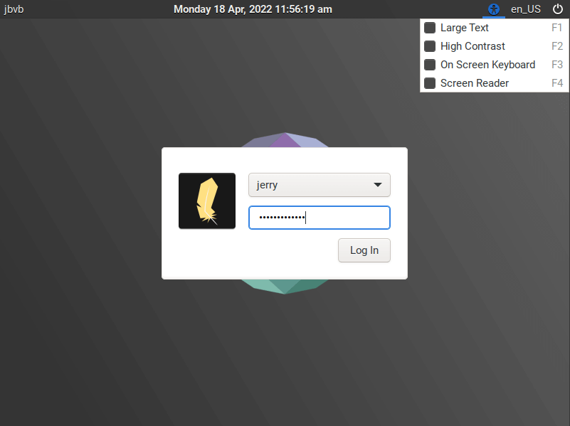 In Linux Lite, we provide a screen reader, a screen magnifier and an onscreen keyboard. The screen reader and the onscreen keyboard can be used on the Login page as shown below.