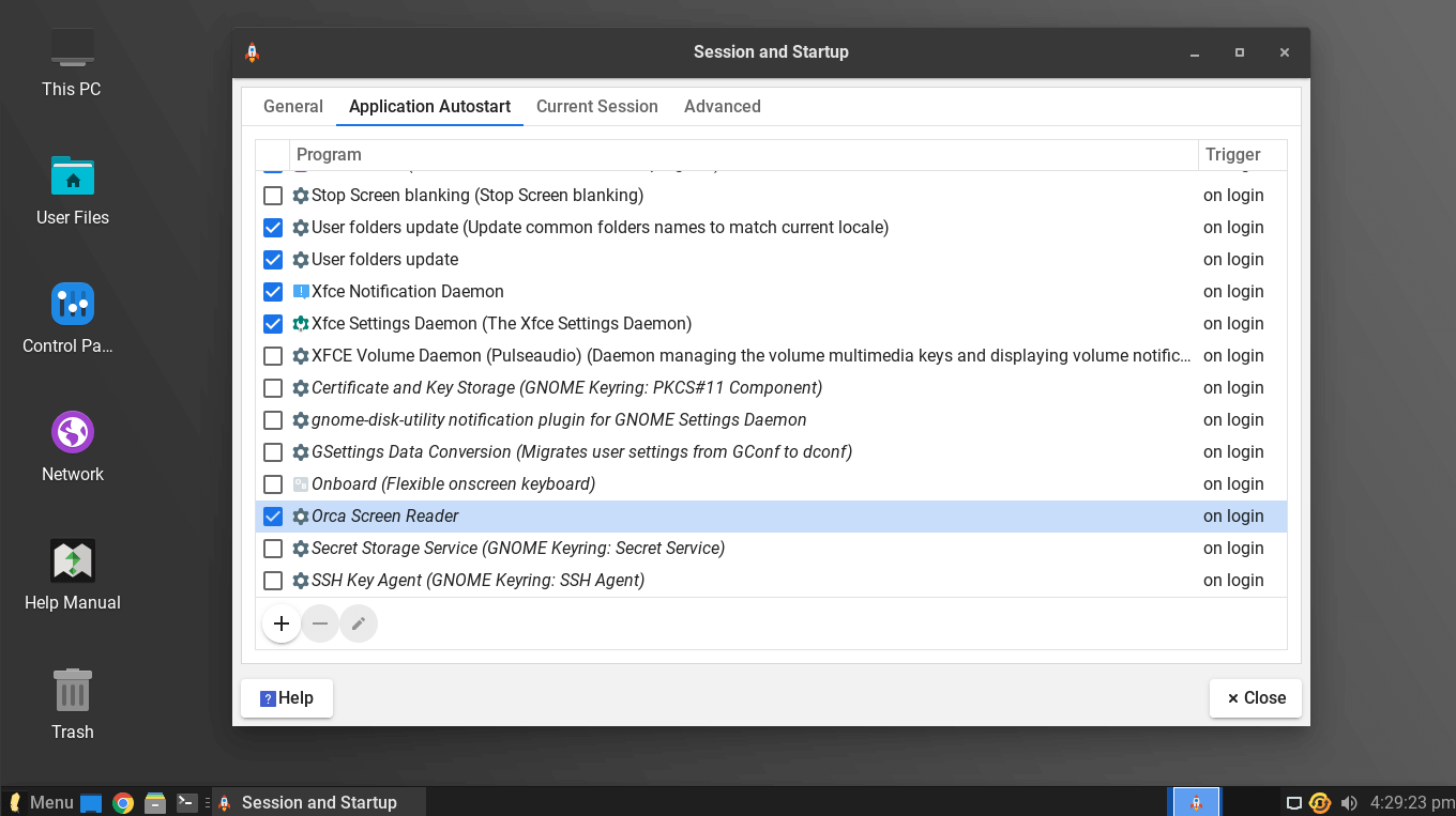 To start Orca when you Login to your Desktop, click on Menu, Settings, Session and Startup. Then click on the Application Autostart tab, locate Orca Screen Reader and put a tick in the box. Logout, then Login again.