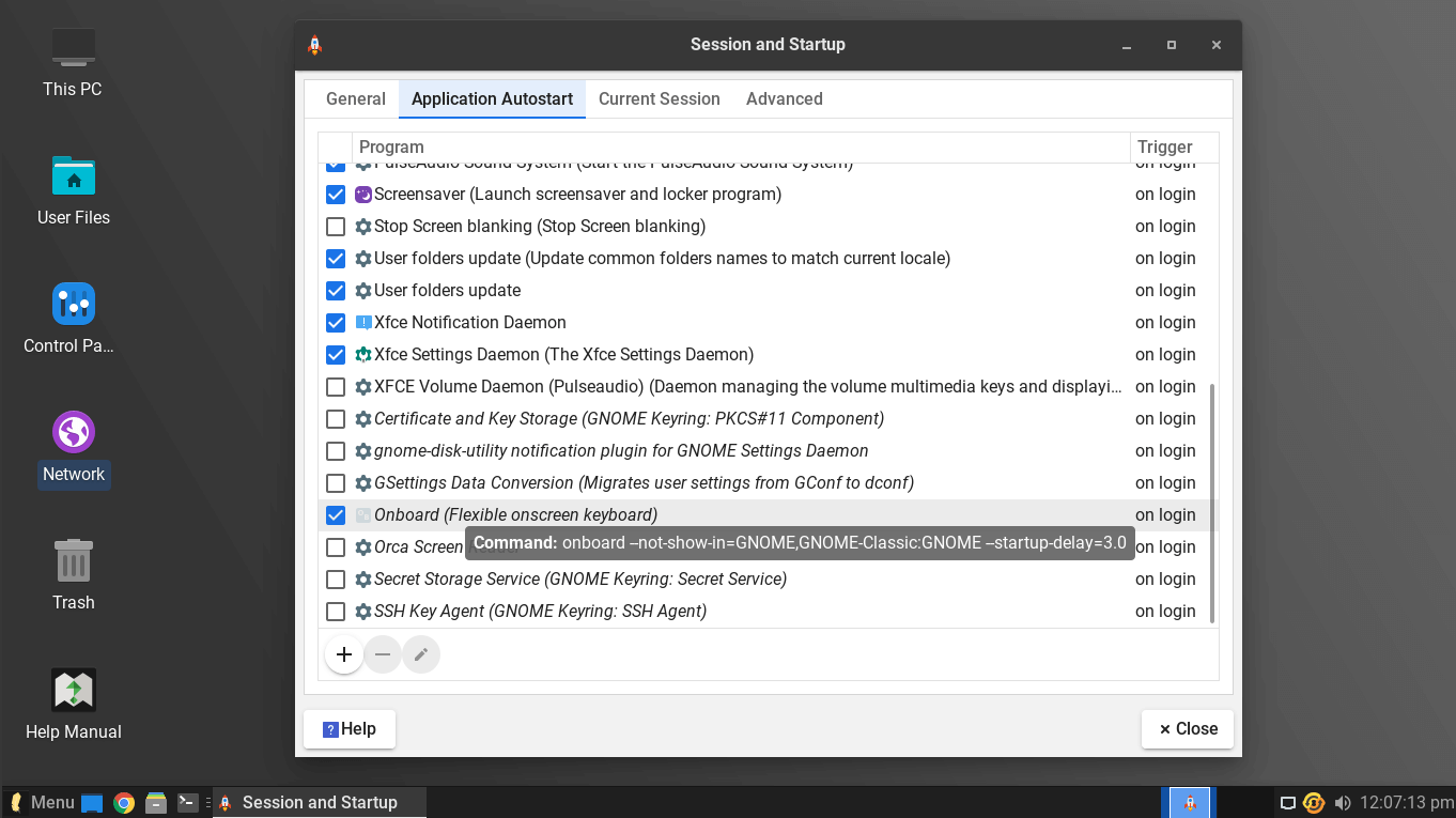 To start the onscreen keyboard when you Login to your Desktop, click on Menu, Settings, Session and Startup. Then click on the Application Autostart tab, locate Onboard and put a tick in the box. Logout, then Login again.