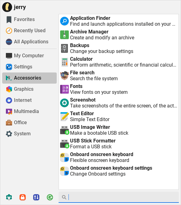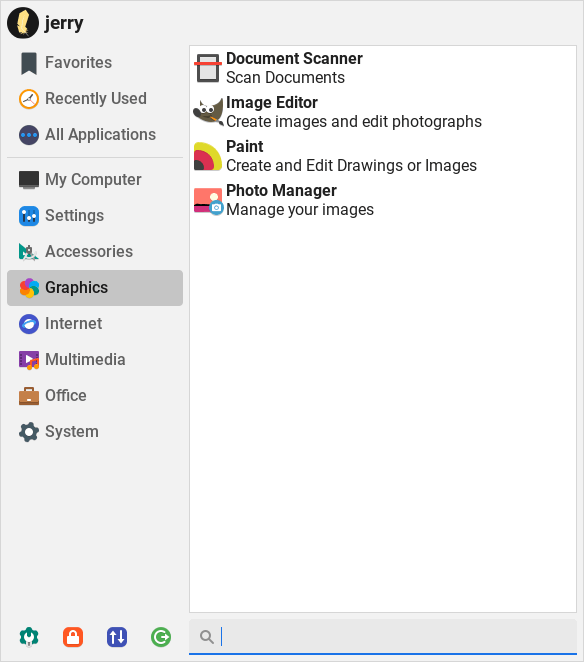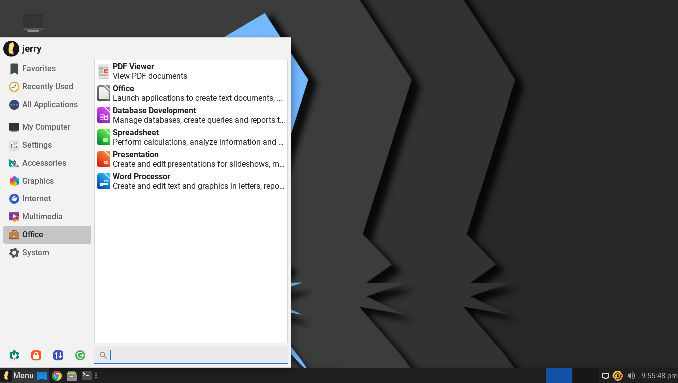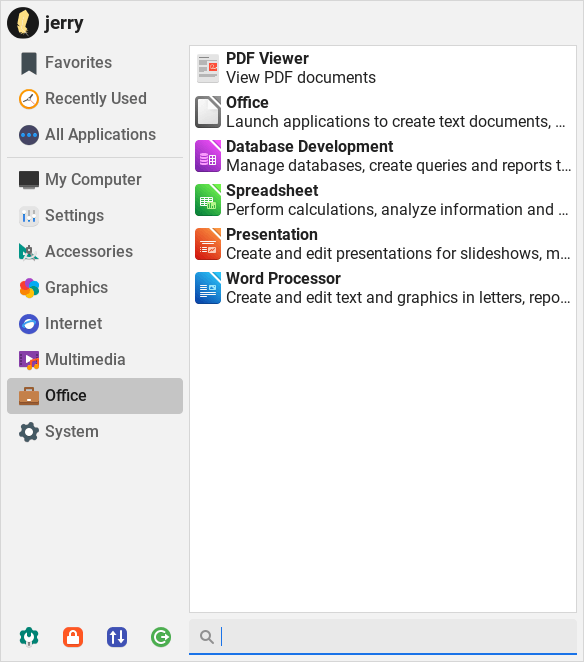 In Linux Lite, when you click on the Menu button, applications are stored in the Menu by category. For example, when you navigate to the Office category, you will see all of the Office like applications.