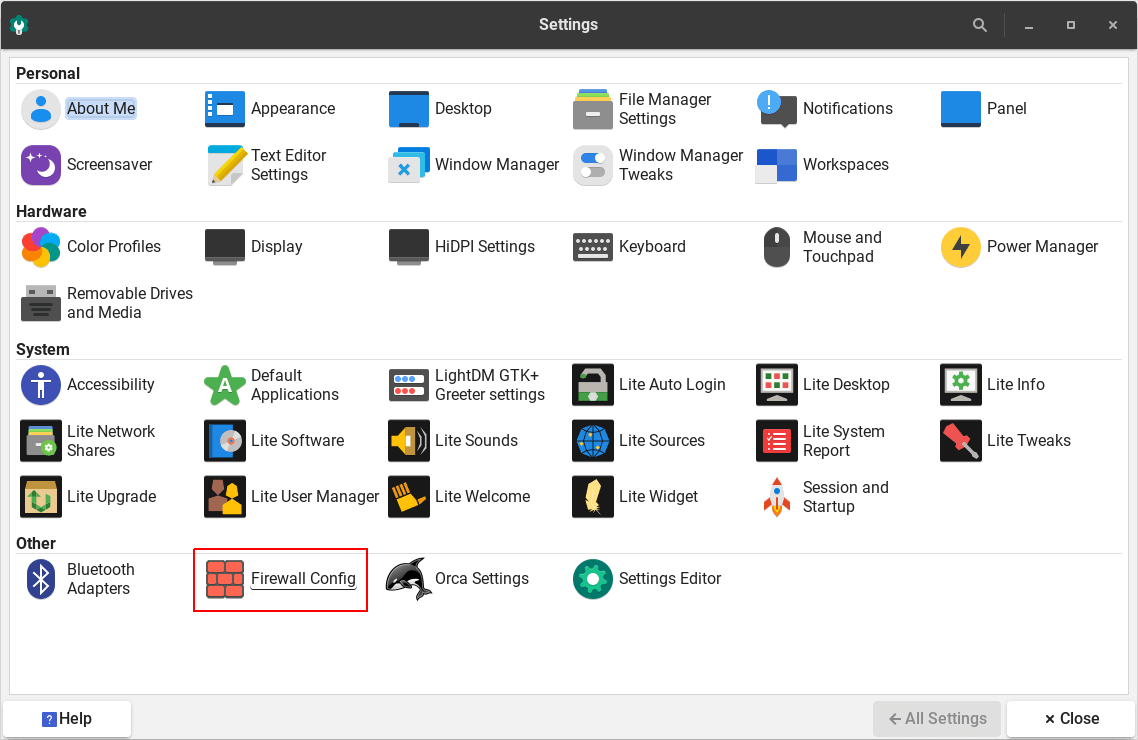 Click on Menu, Settings, Settings Manager. Now click on Firewall Config.